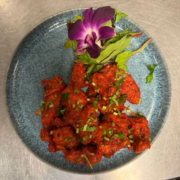 Crispy fried chicken tossed with south indian spices, curry leaves & chillis.