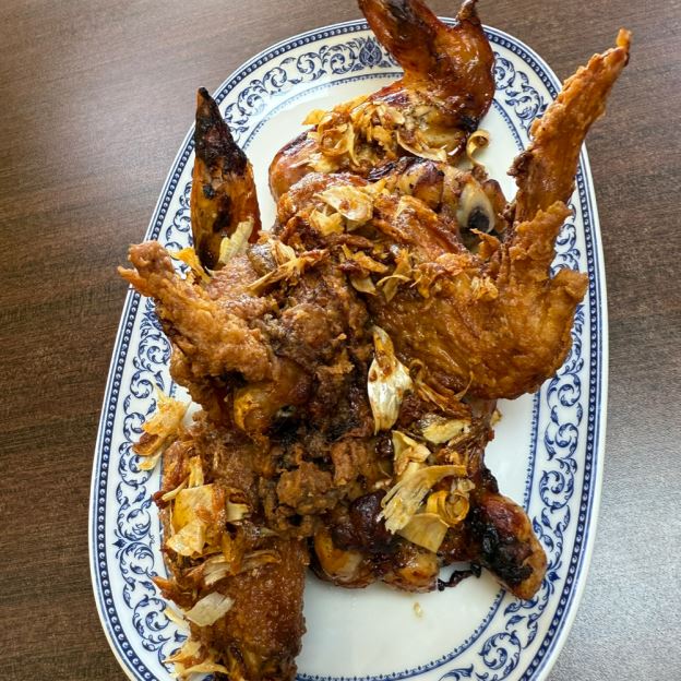 SAUTÉED CATFISH SLICES LIGHTLY BATTERED W/ GARLIC MINCE, HOT CHILIS, ONION, BELL PEPPERS, CARROT, MUSHROOM, AND BASIL LEAVES W/ A BASIL SAUCE