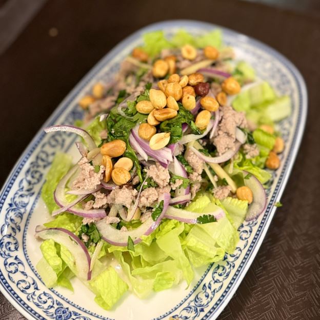 GROUND PORK SEASONED W/ CHILI LIME DRESSING, PEANUT, FRESH GINGER, RED ONION, CILANTRO, CARROT, AND GREEN ONION