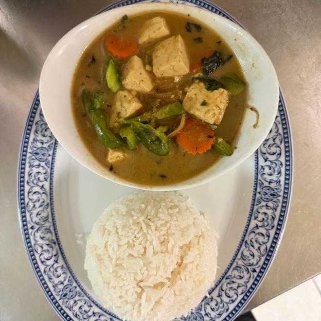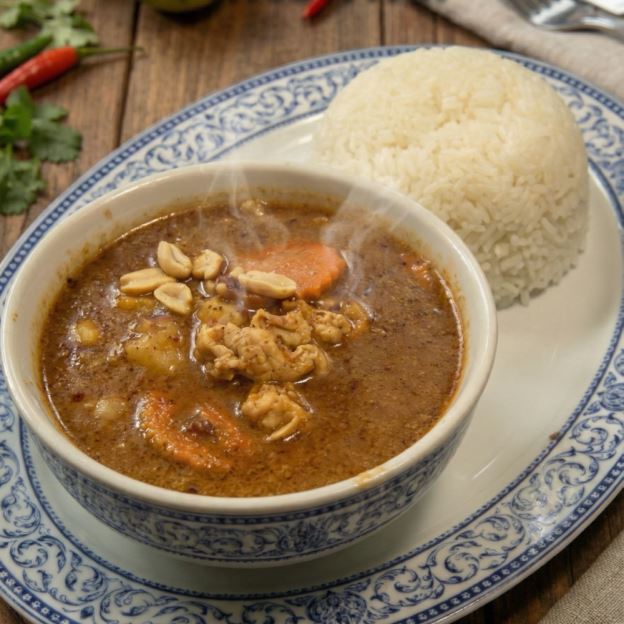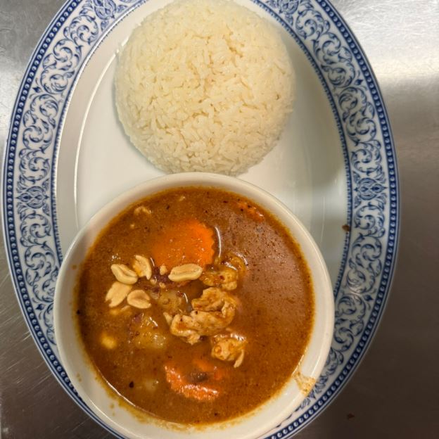 TENDER CHICKEN BREAST SAUTEED IN AN AUTHENTIC THAI MASSAMUN CURRY W/ POTATOES, CARROTS, AND PEANUTS