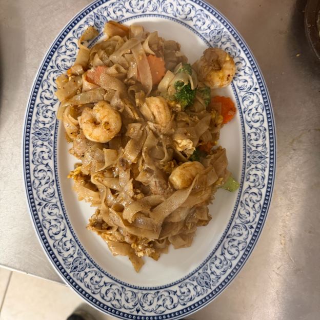 THAI RICE NOODLE, WOK FRIED W/ SHRIMP AND CHICKEN, EGG, BEAN SPROUTS, CHIVES, AND PEANUTS