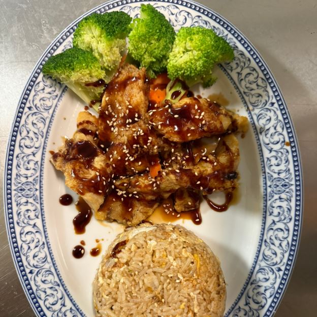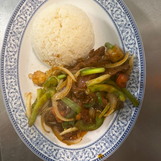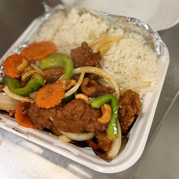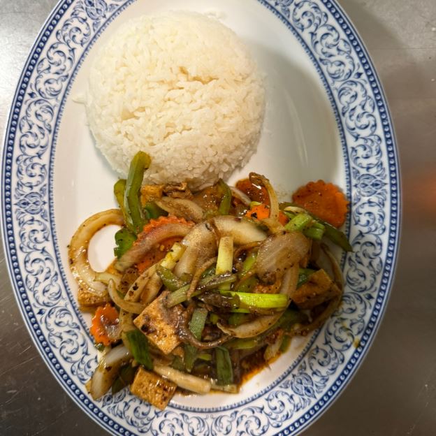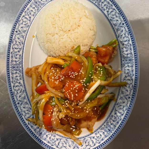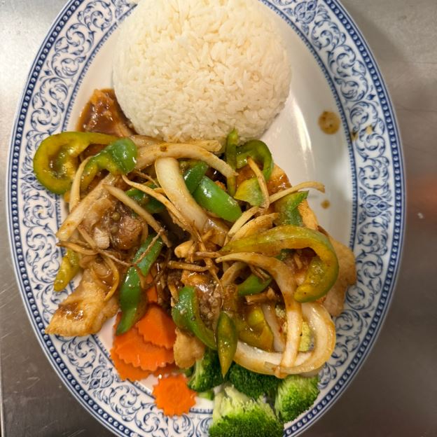 STIR-FRIED WHITE CHICKEN MEAT W/ GINGER, ONION, GREEN ONION, BELL PEPPER, BABY CORN, MUSHROOM, AND CARROT IN A FLAVOR-LASTING HOUSE SAUCE