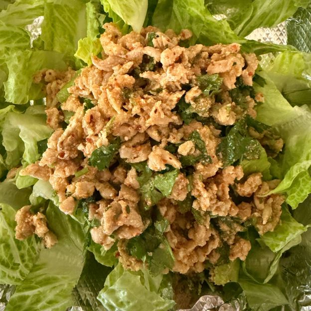 GROUND CHICKEN SEASONED W/ THAI SPICES, LIME JUICE, GREEN ONION, RED ONION, AND CILANTRO