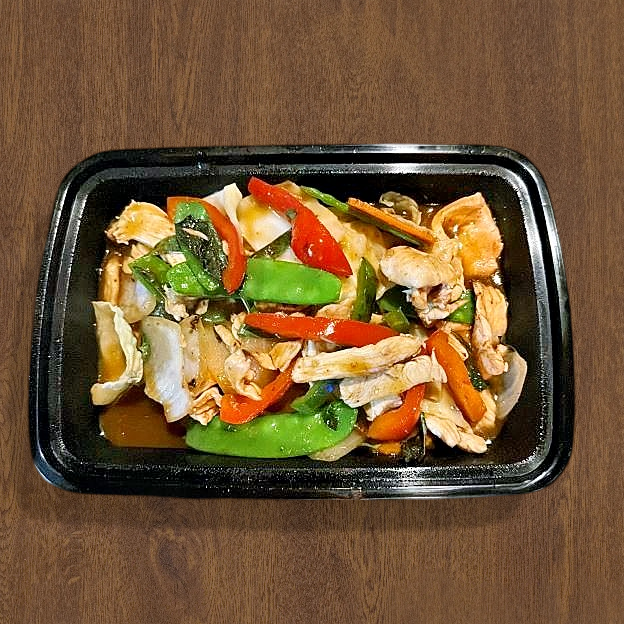 Panang chili paste with ground peanuts, snow peas, bell peppers and string beans