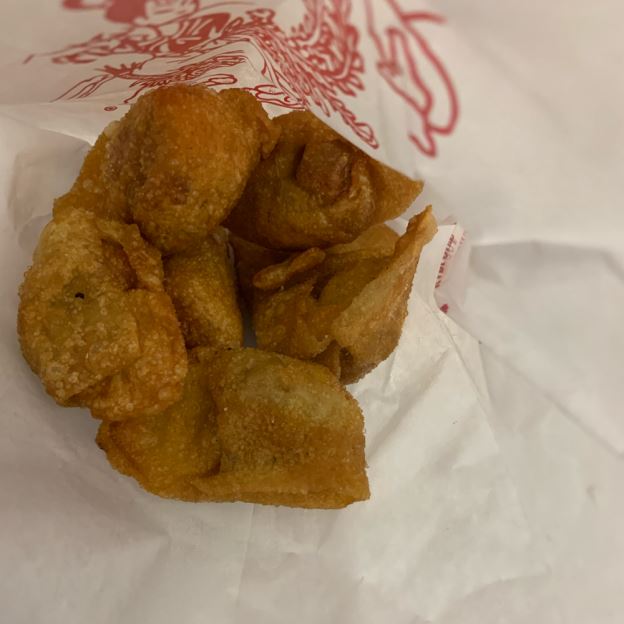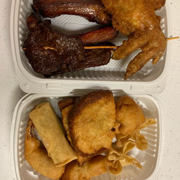 Spring roll (2), spare ribs (2), beef stick (2), chicken wings (4), fantail shrimp (2), and shrimp toast (2), chicken finger (2), crab rangoon (2)