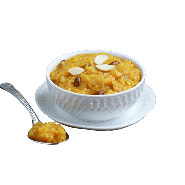 Warm semolina dessert cooked with ghee, sugar, cardamom, and nuts.