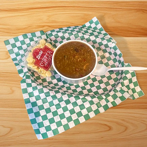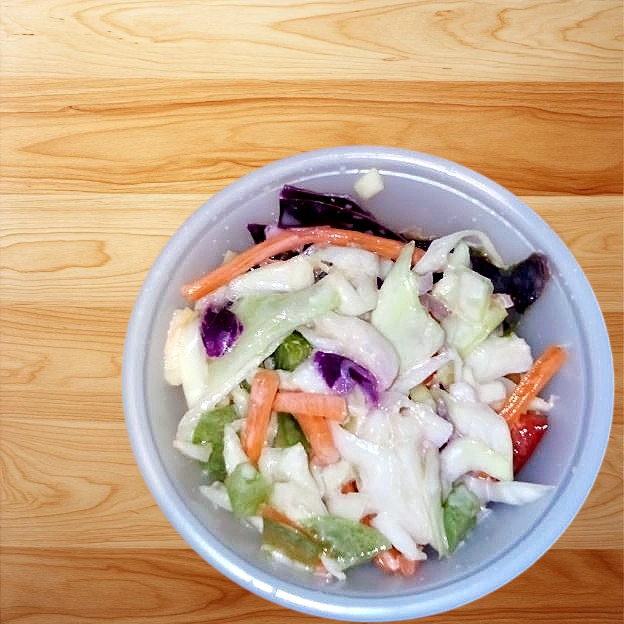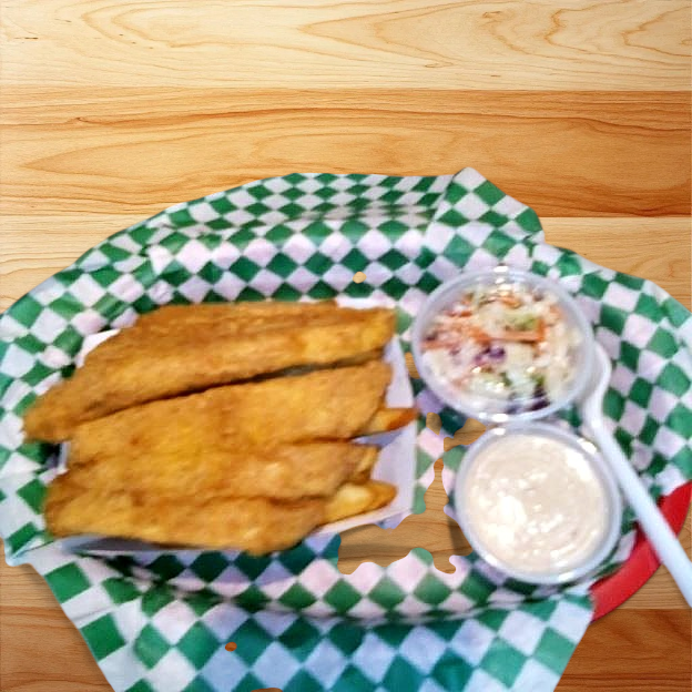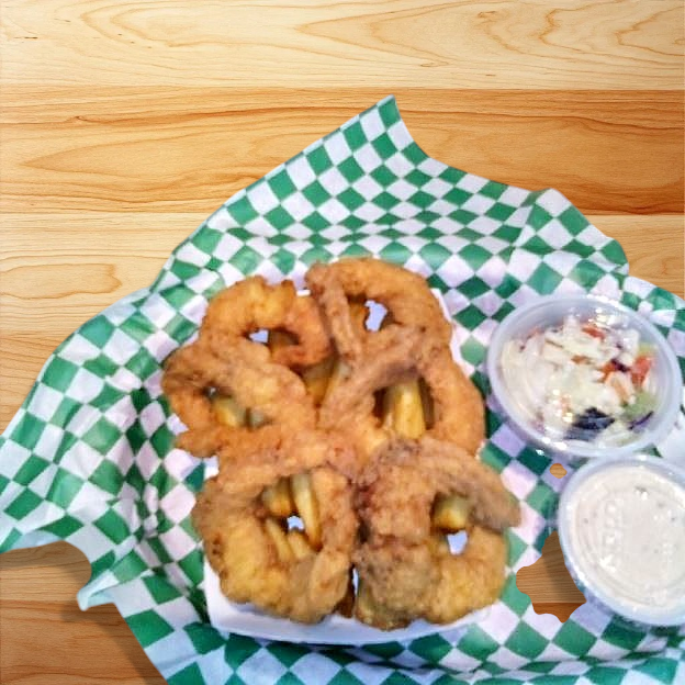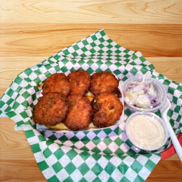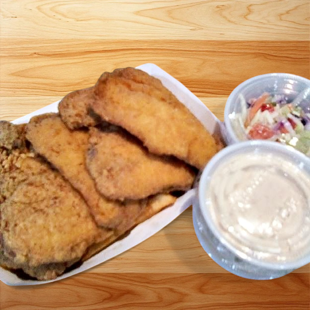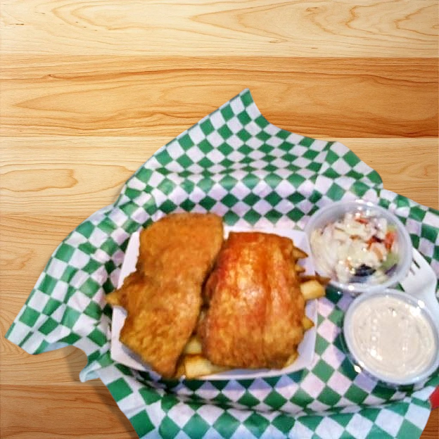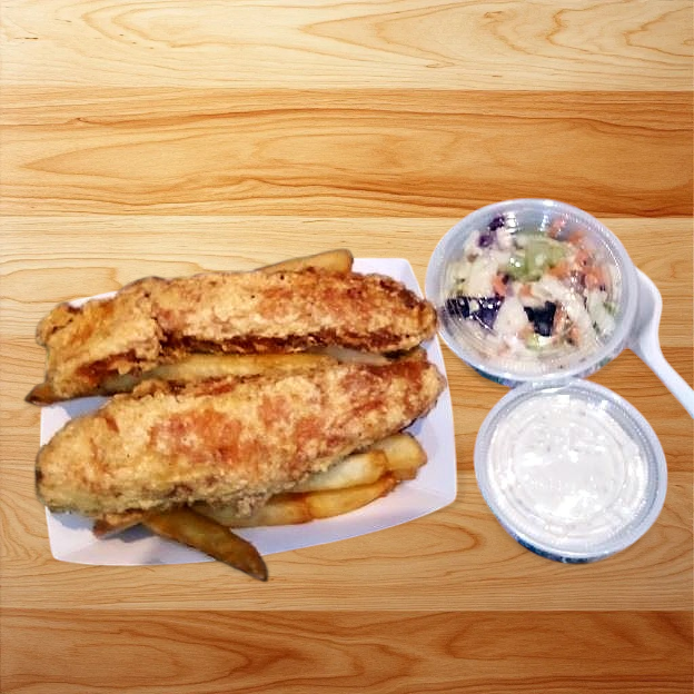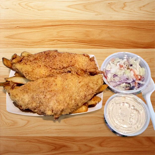 1 PIECE ALASKAN COD, 1 PIECE HALIBUT, 1 PIECE SALMON, 1 PIECE CATFISH, 3 PRAWNS, 3 CRAB PUPPIES, CLAMSTRIPS, HAND CUT & FRENCH FRIES. 4 CONTAINERS OF TARTAR SAUCE AND 2 OF CONTAINERS COLESLAW