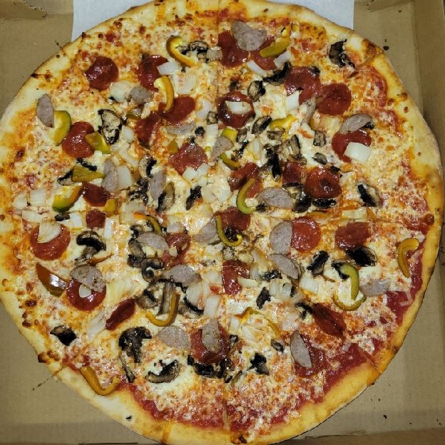 Pepperoni, sausage, mushrooms, onions, and peppers.