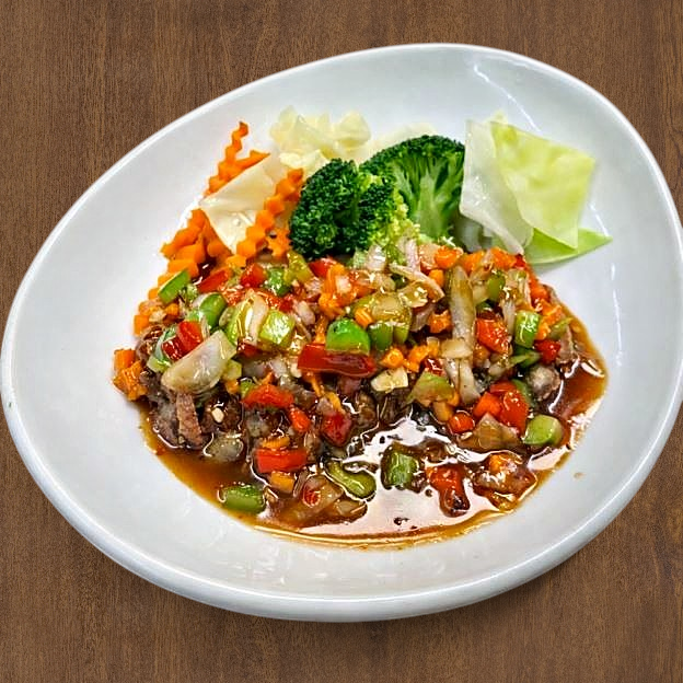 with chopped bell peppers, onions, carrots, crispy garlic in special garlic sauce