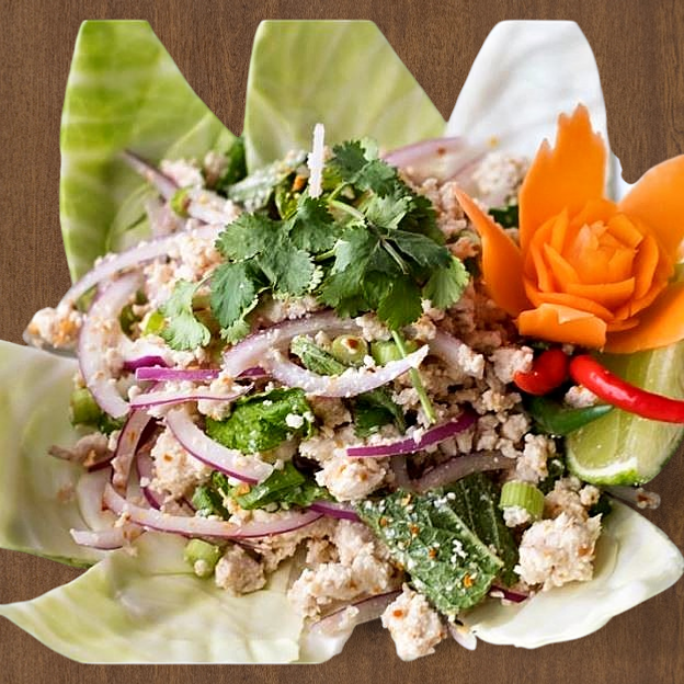 fresh green papaya salad with tomatoes, peanuts. (add grilled shrimps or Laos style with pickle crab $12.95)