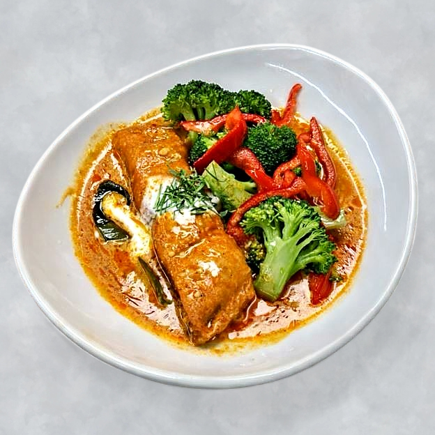 (Stir-Fried with Spicy fresh thai herbs) Stir fried red/green bell peppers, krachai, mushroom, green bean, lime leaf, basil leaf, baby corn and red curry paste
