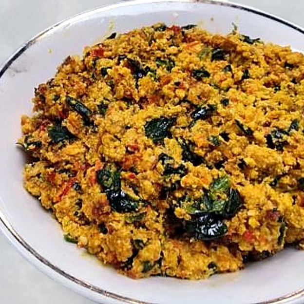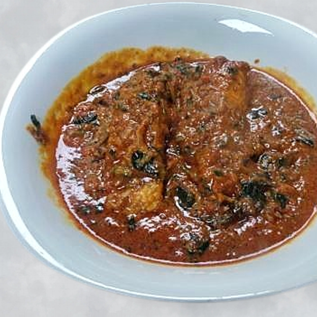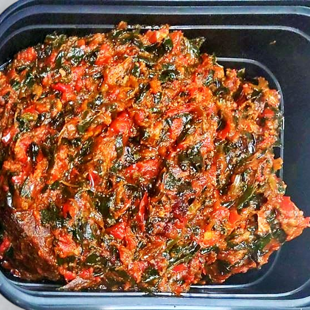 Efo Riro is a highly nutritious dish made with freshly chopped spinach cooked in a rich palm oil stew garnished with various proteins such as beef, tripe, shrimp