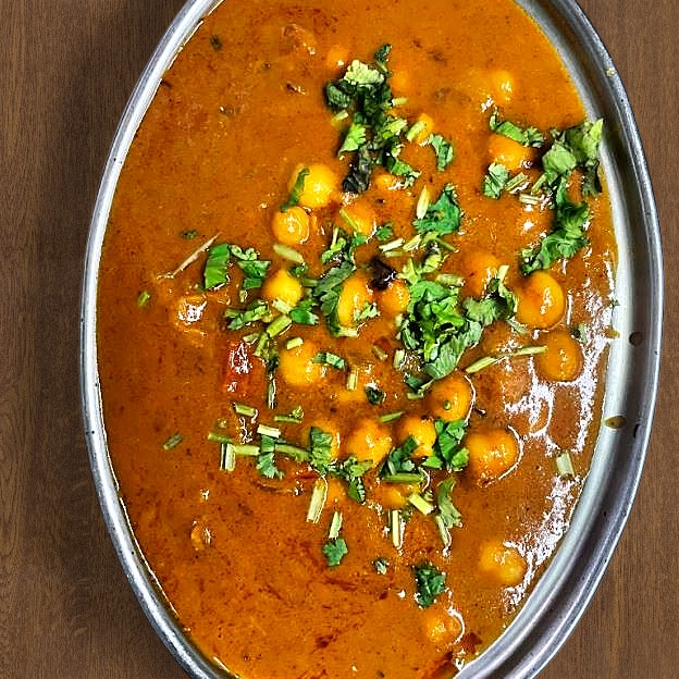 Turnovers made with a tender flaky light pastry and filled with seasoned potatoes, green peas and cashews and served with chickpeas cooked in onion, tomato gravy with spices and topped with yogurt.