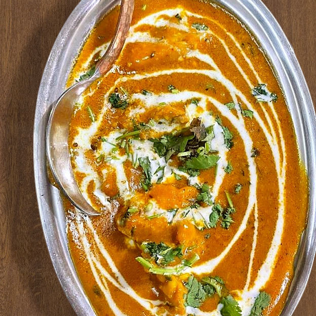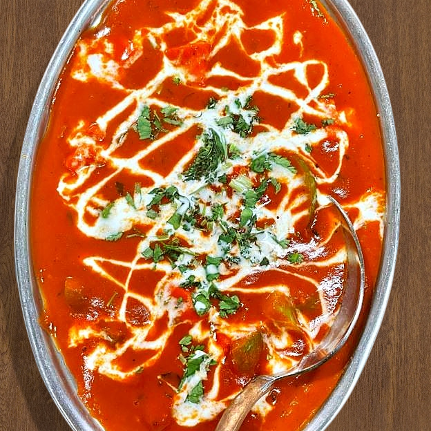 Chicken soup with lentils subtly flavored with delicate herbs and a dash spices garnished with sliced tandoori chicken.