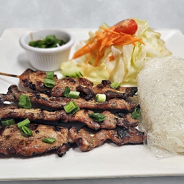 Barbecue Pork in the Skew, comes with sticky rice, small house salad, and tamarind dipping sauce.