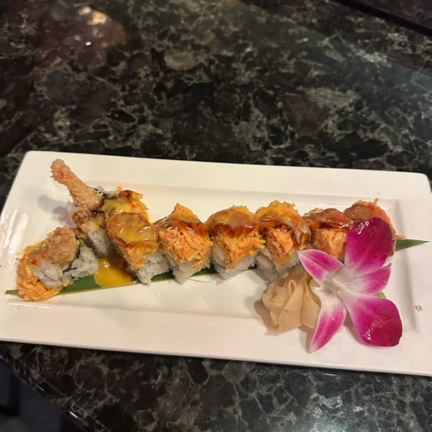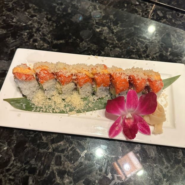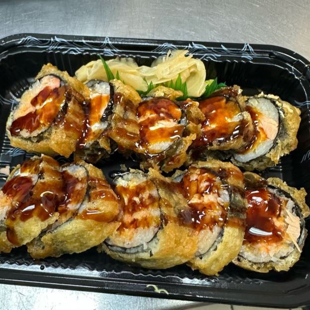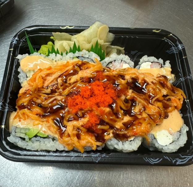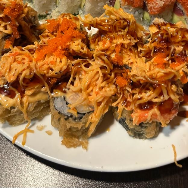Sliced avocado wrapped spicy crabmeat inside with spicy mayo, eel sauce & masago