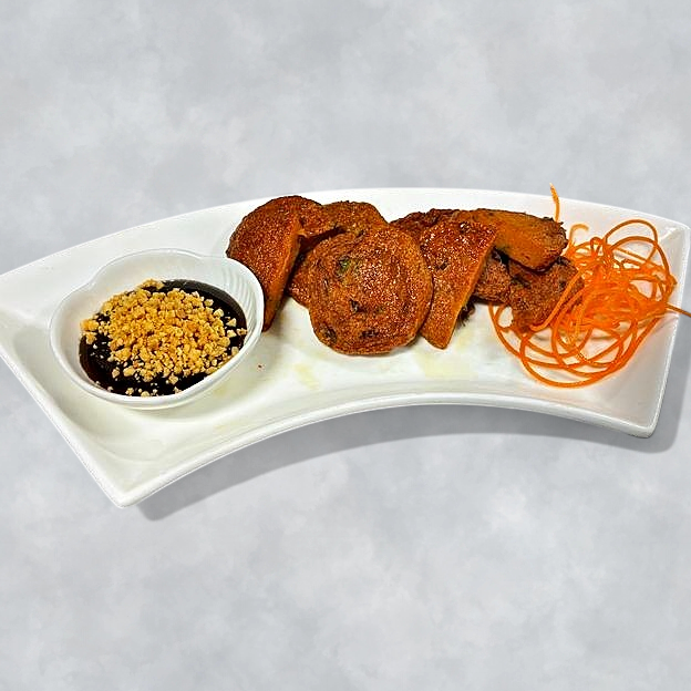 Deep-fried Thai fish cake served with cucumber in sweet and sour sauce, topped with ground peanut.