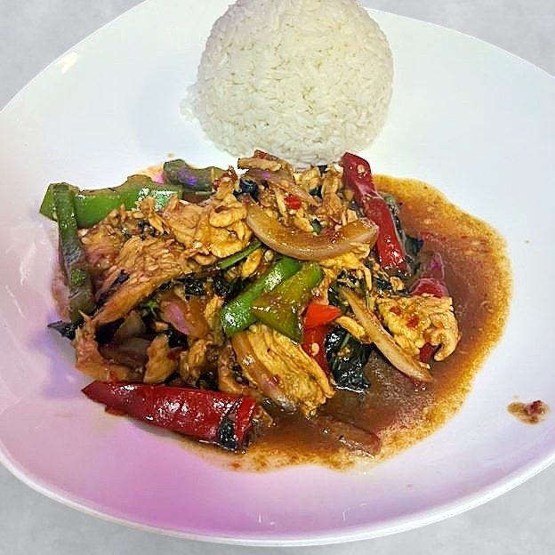 Grilled sliced beef mixed with spicy lime juice, chili, tomato, cucumber, carrot, onion, scallion, and cilantro. Hot spicy.