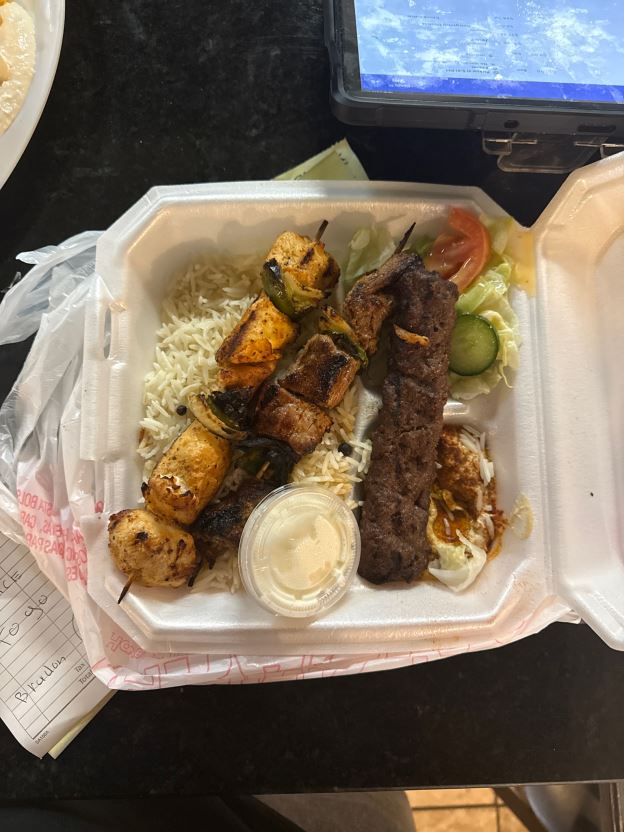 white Special sauce, chicken or beef or gyros, tahini, cheese and hot sauce