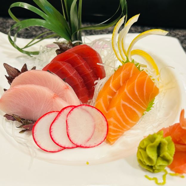 3 pieces of sushi, 5 pieces of sashimi, spicy tuna maki