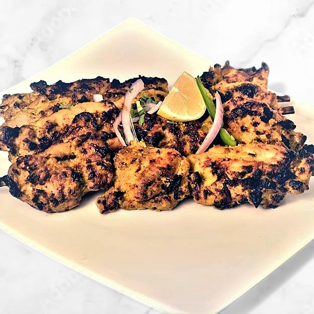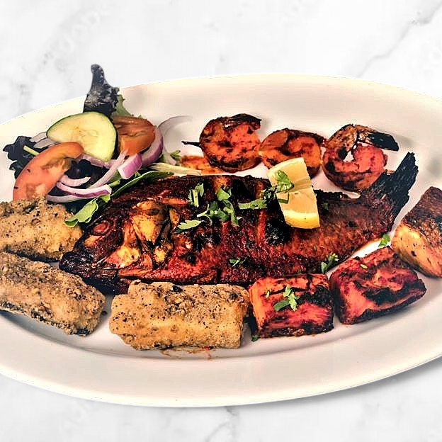 Chicken and lamb. Chicken seekh kabab, tandoori shrimps, chicken tikka, and lamb boti kabab.