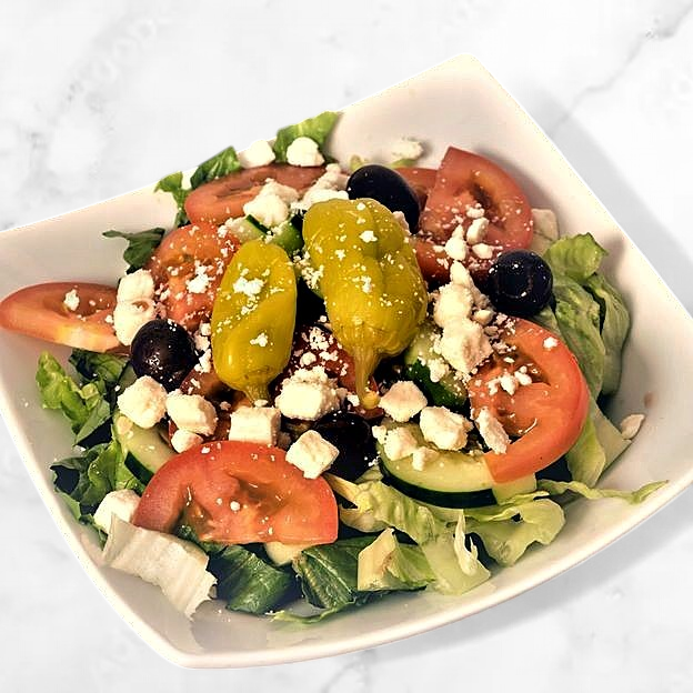 Vegetarian. Greens topped with black olives, tomatoes, cucumbers, feta cheese, and pepperoncini balsamic vinaigrette dressing.