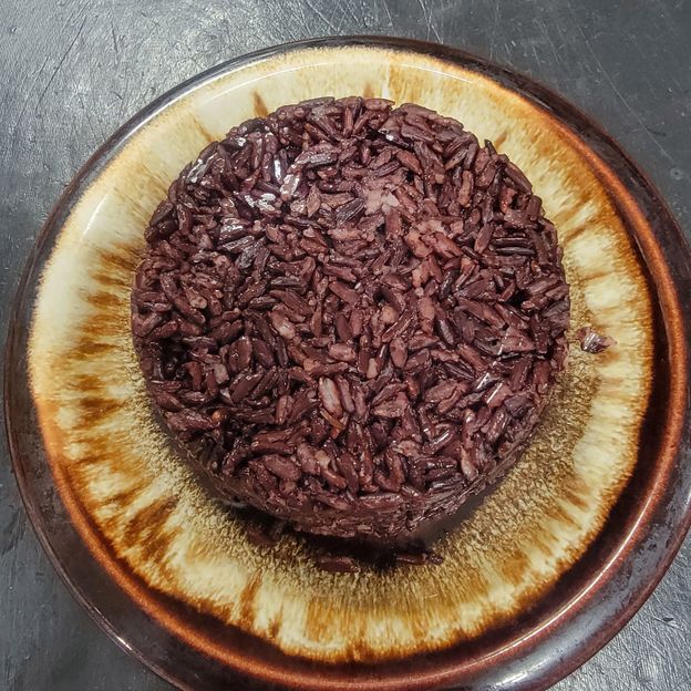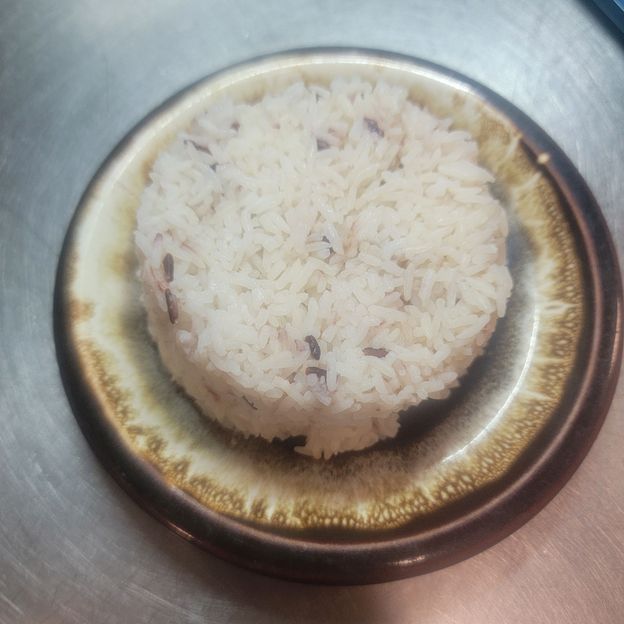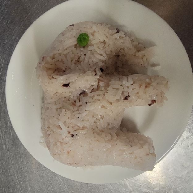 Fried rice with mixed vegetable, tofu and mock duck. Curry powder, pineapple, pea carrots, tomatoes, onion, raisin and scallion