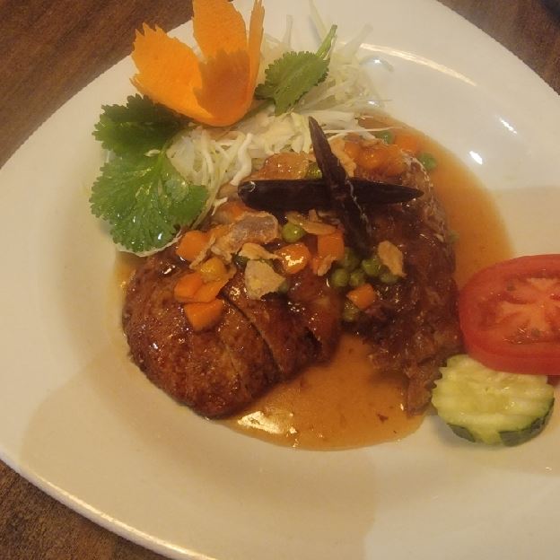 Chicken, potatoes and onion cooked with curry powder. Served with sweet vinegar cucumber