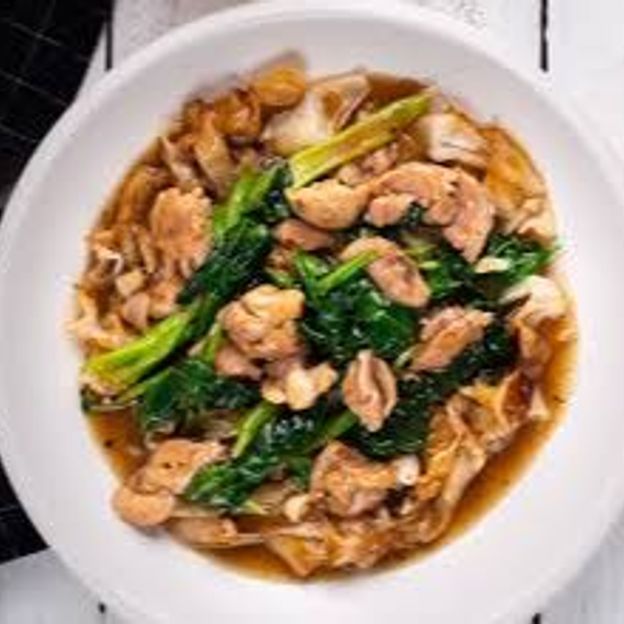 Mixed vegetable, tofu and mock duck, fresh flat noodles, richness of black sweet soy sauce