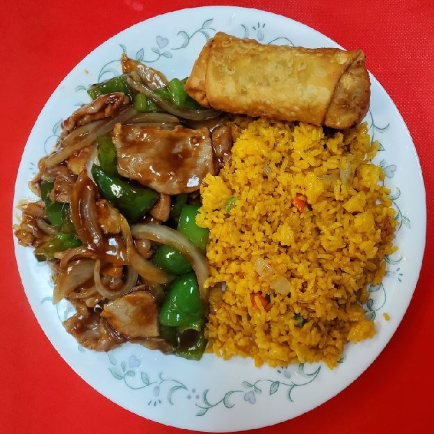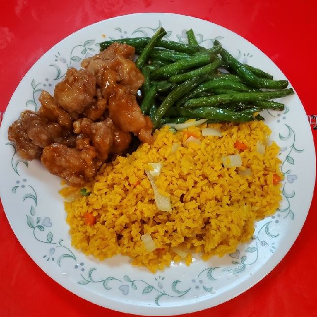String bean with chicken served for lunch. Options include white rice or fried rice. Possible add-ons: beef, chicken, pork, shrimp with fried rice or lo mein.