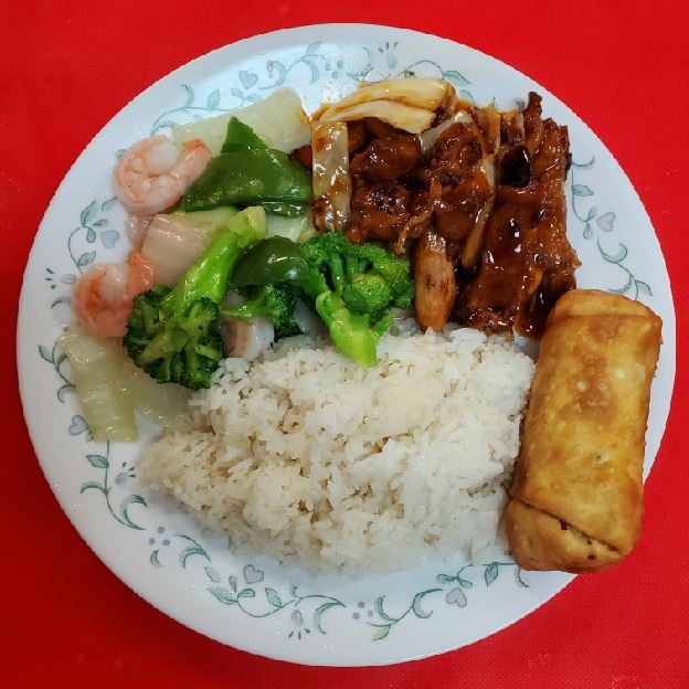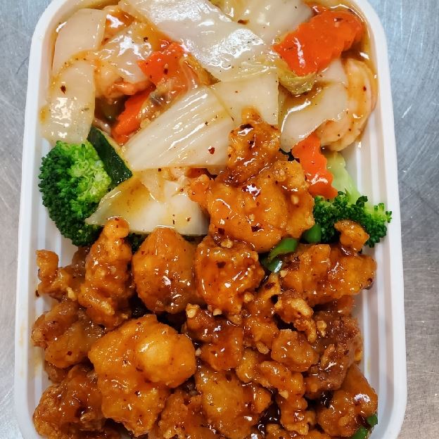 Chicken and shrimp served with choice of rice or Lo Mein, including beef, chicken, pork, or shrimp variations.