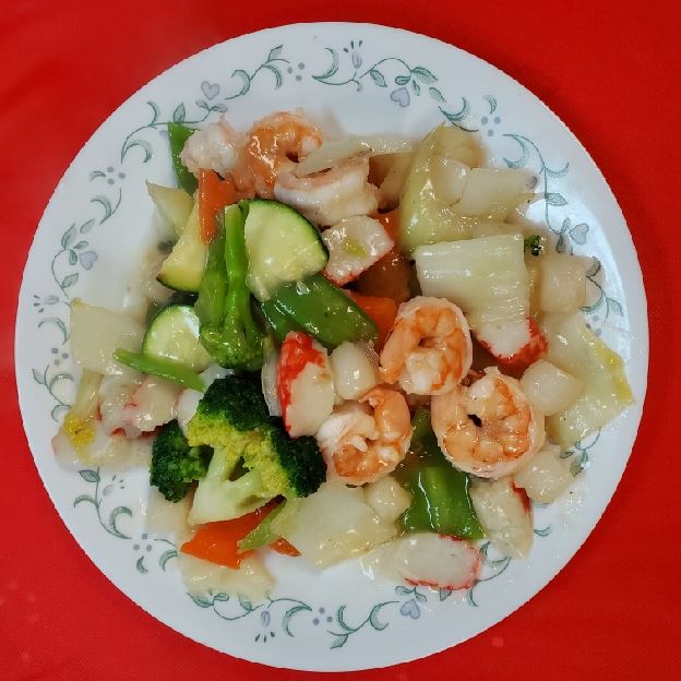 Baby shrimp & mixed vegetable w. Spicy Szechuan sauce