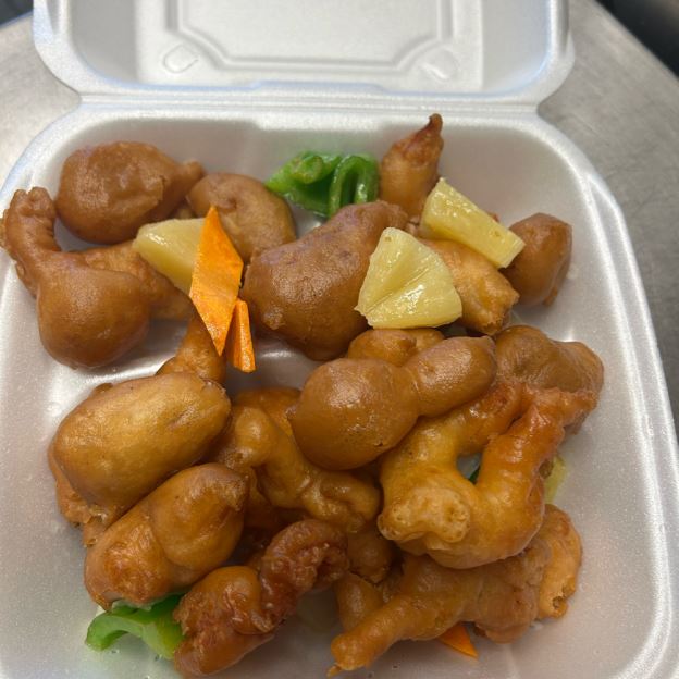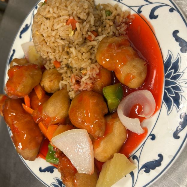 Chicken, pork and shrimp fried and served with tangy sweet and sour sauce.