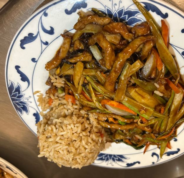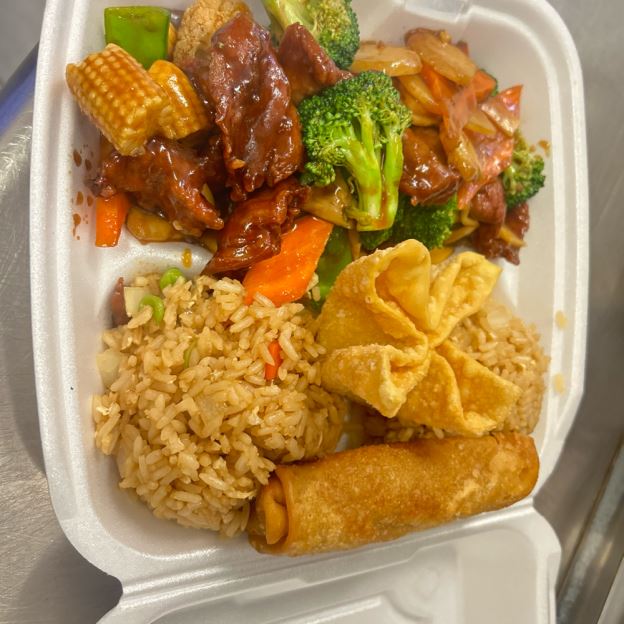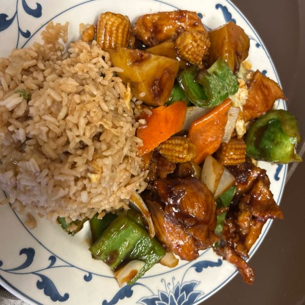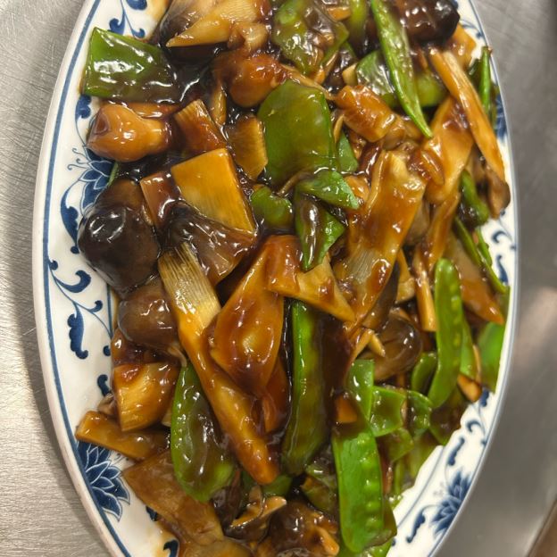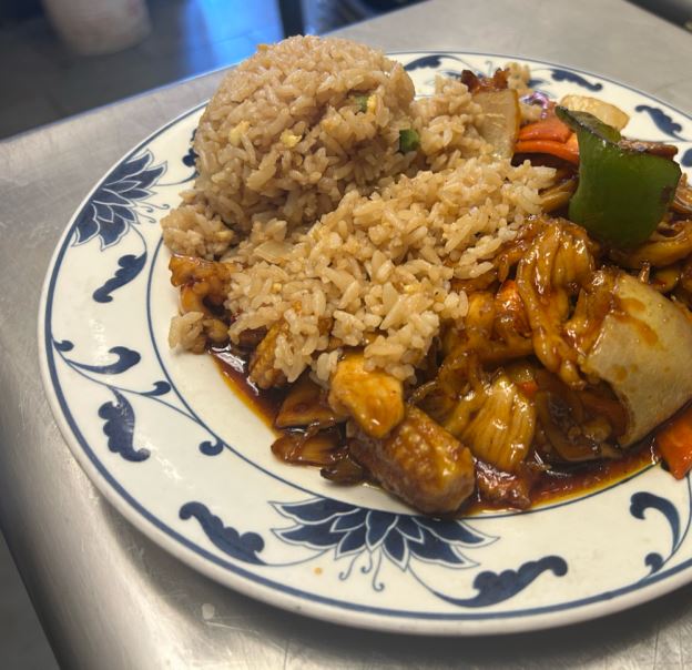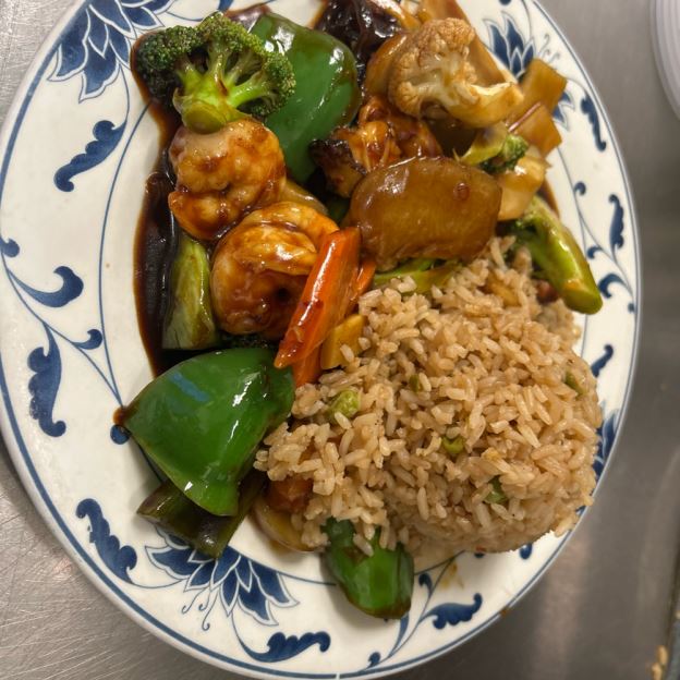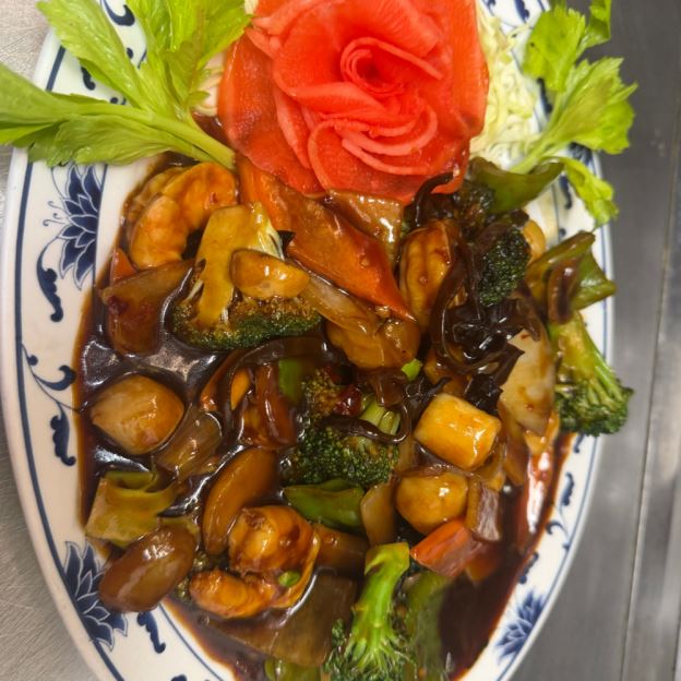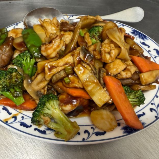 Chicken, shrimp, pork, scallops mixed with vegetables in a delicious brown sauce.
