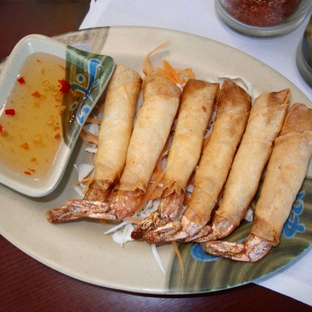 6 pieces deep-fried shrimp wrapped in spring roll skin and served with sweet and sour sauce.