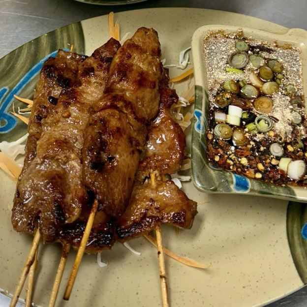 5 pieces of grilled chicken tenders, lightly marinated and served with homemade peanut sauce and cucumber salad.
