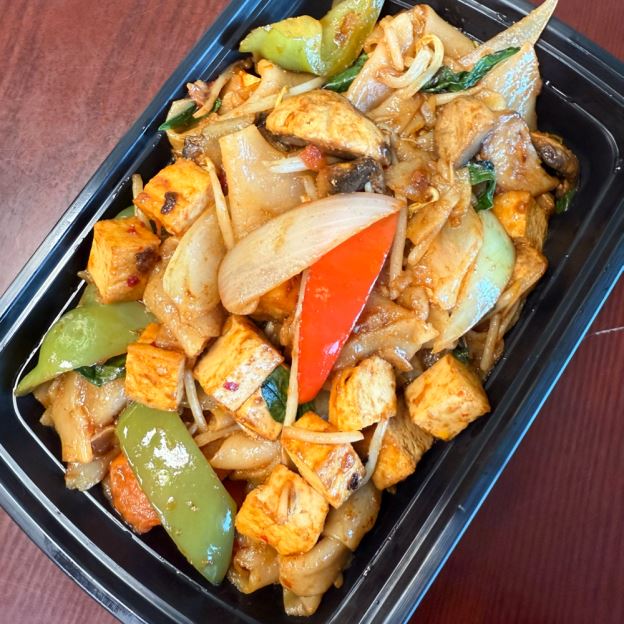Lunch portion of our Pad Kee Mao with chicken or tofu, Cool Cucumber Salad, and veggie eggroll. Choose a different protein for additional costs.