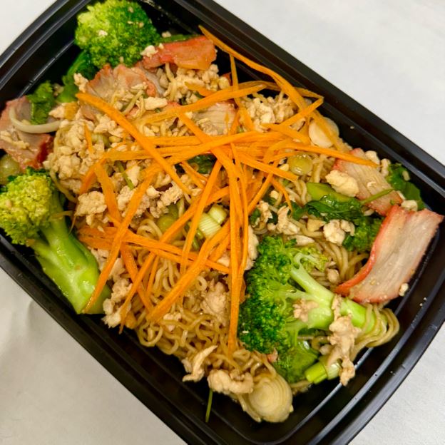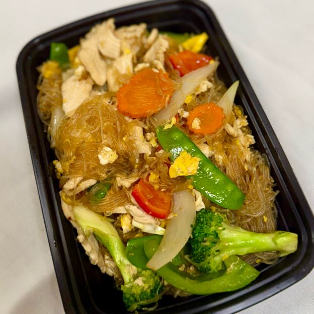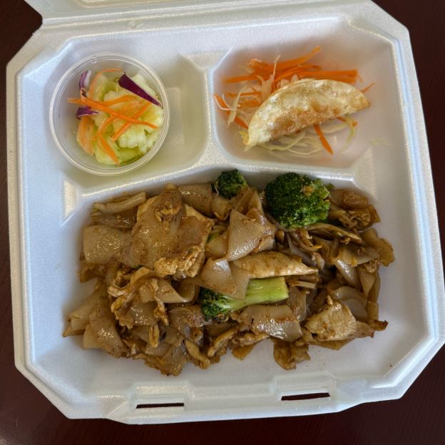 Lunch portion of our Pad Siew with chicken or tofu, Cool Cucumber Salad, and veggie eggroll. Choose a different protein for additional costs.