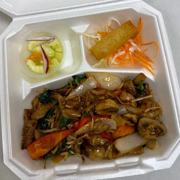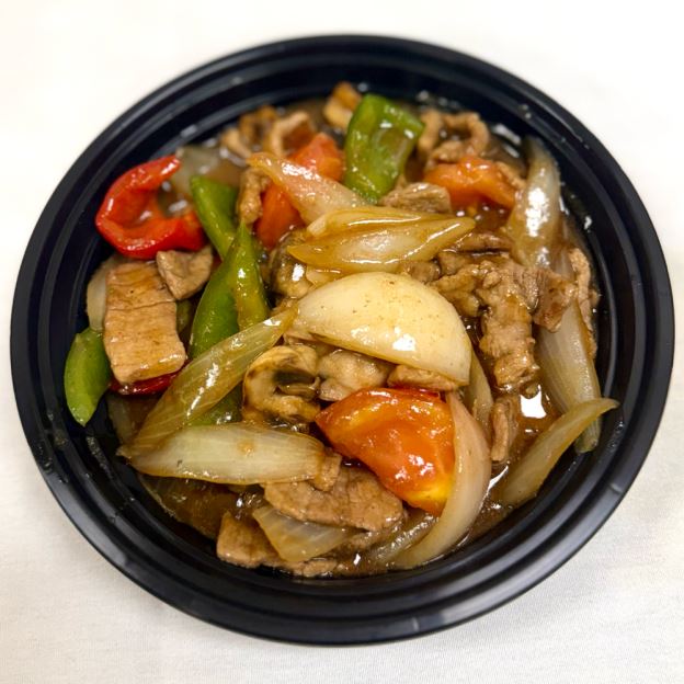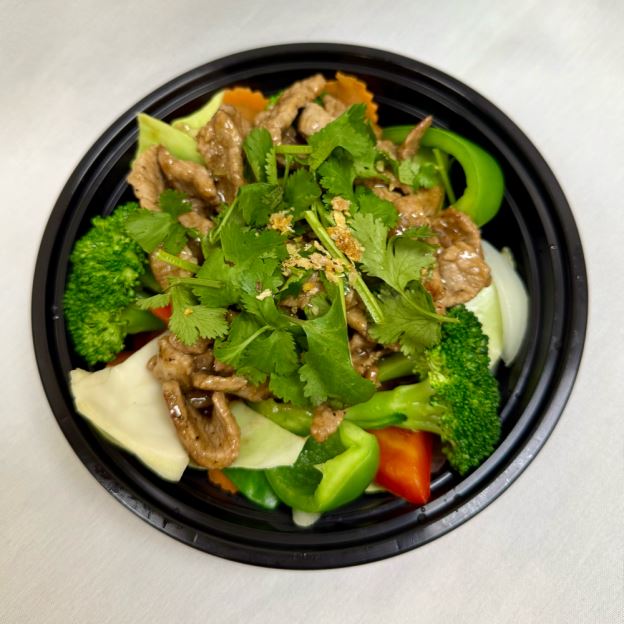 Lunch portion of our Pepper stir fry with chicken or tofu, Cool Cucumber Salad, and veggie eggroll. Choose a different protein for additional costs. Option for brown rice.