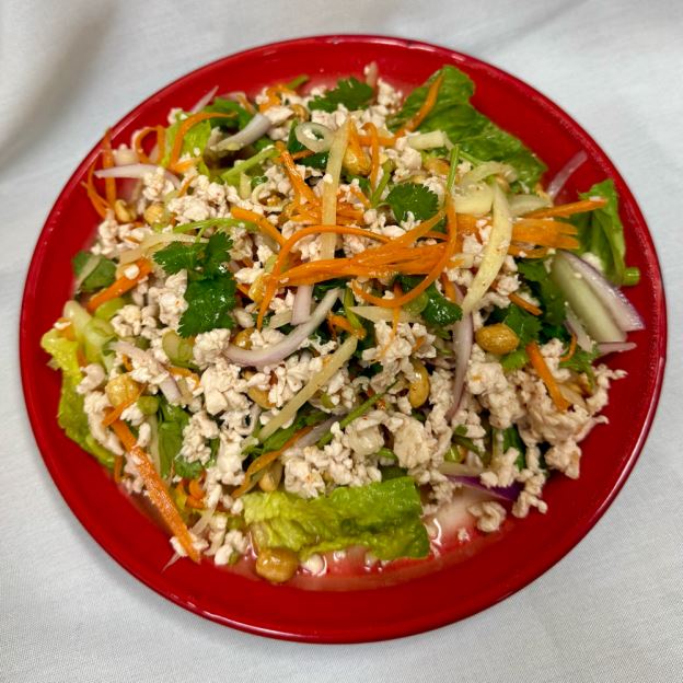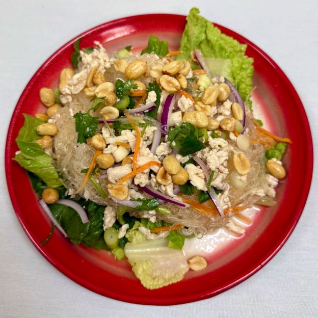 Clear glass noodle, ground chicken, onion, carrots, roasted peanut and cilantro in a tangy & spicy homemade dressing.