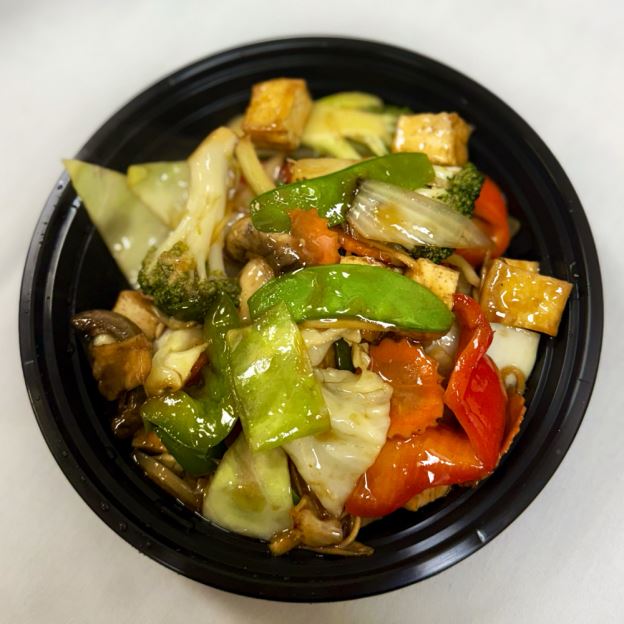 Lunch portion of our Royal Veggie Delight with chicken or tofu, Cool Cucumber Salad, and veggie eggroll. Choose a different protein for additional costs.