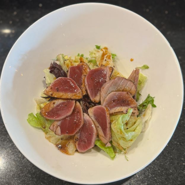 Mixed greens salad with seared tuna on top, served with ponzu sauce