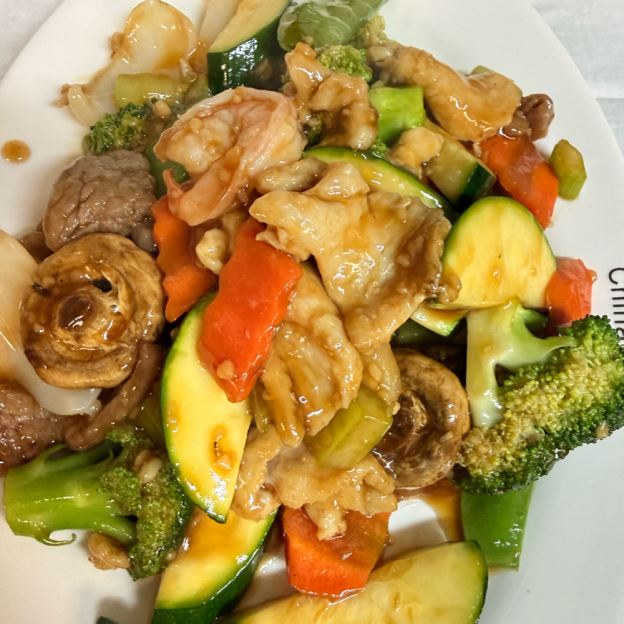 Fried Prawns, Crab Puffs, Wonton Soup. Entrée: Beef Broccoli, Sweet & Sour Pork, BBQ Pork Fried Rice. For Party Of 3 Add: Almond Chicken For Party Of 4, Add: Mu Shu Pork. For Party Of 5, Add: Prawns w. Lobster Sauce. For Party Of 6, Add: Vegetables Deluxe. 7 Or More: Portines Of Above Increased