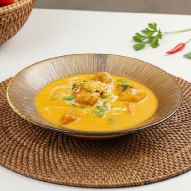 Green curry paste in coconut milk with eggplant, bell peppers and basil leaves.