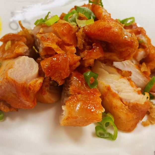 Fried Chicken, Crab Salad. Edamame. Torrato, Cirumber. Corn, Pireapple, Spicy Mayo. Teriyaki Sauce. Crispy Green Onim. Sesame Seeds