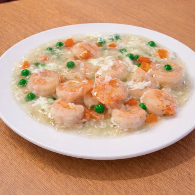 Shrimp, chicken, breast meat, snow peas, and carrots.