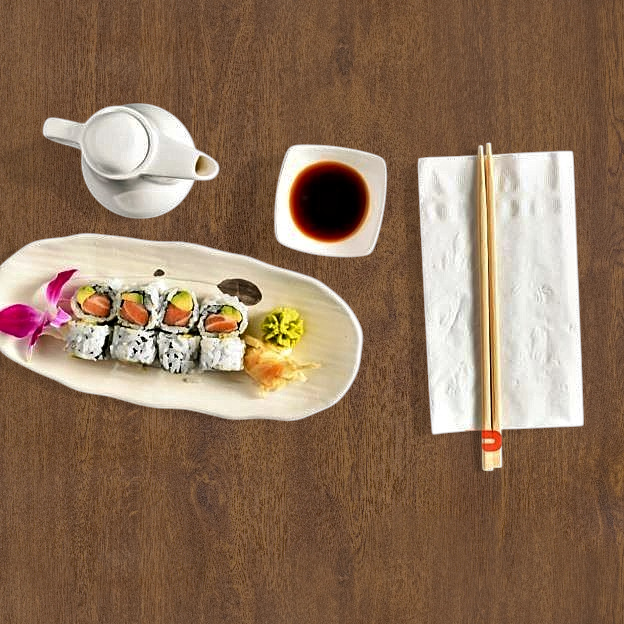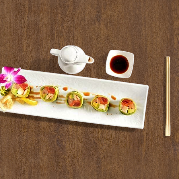 Rice paper tuna, salmon, yellowtail, super white tuna hot sauce