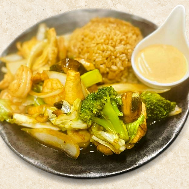Mushroom, broccoli, cabbage, onion, chicken and shrimp with teriyaki sauce