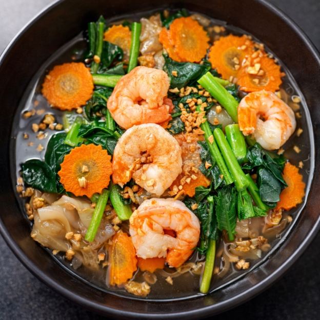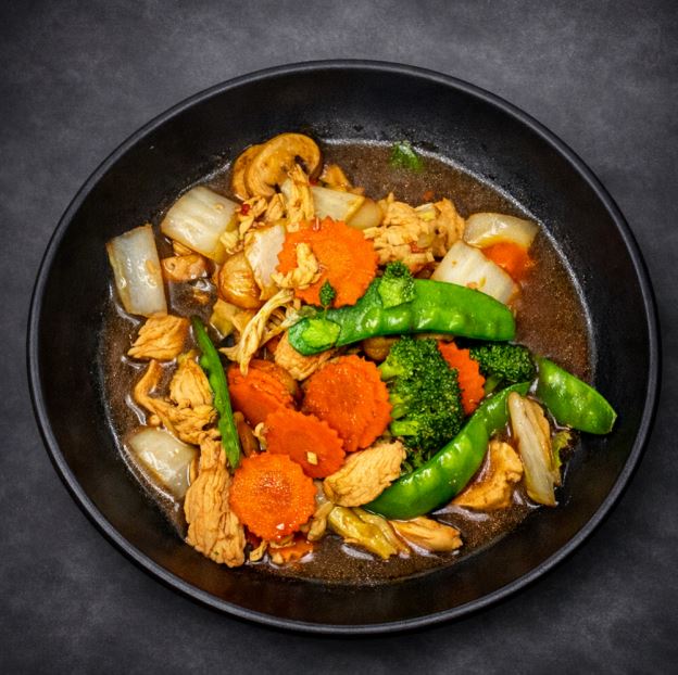 Shrimp, scallops, crabmeat, broccoli, bamboo shoots, mushrooms, napa, peapods and water chestnuts, carrots and baby corn stir fried in a brown sauce