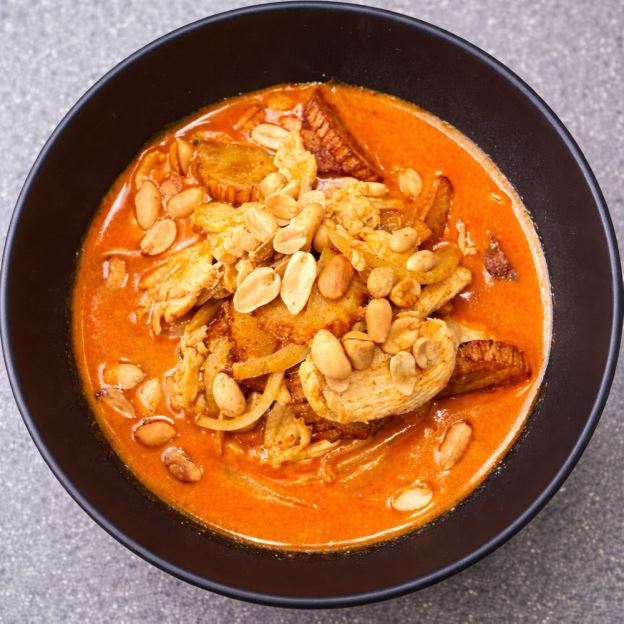 Grilled marinated chicken on skewer serve with our homemade peanut sauce, salad and cucumber salad.